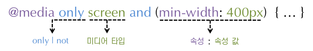 미디어 쿼리 속성은 프로그래밍 언어와 같이 =, >, <등의 연산자를 사용하지 않으며 속성 명 앞에 min- 를 붙여서 최솟 값, 최댓 값을 판단합니다. 속성은 and (속성: 속성 값) and (속성: 속성 값)으로 나열 할 수 있으며 min- max- 를 이용 할 경우 범위로도 설정이 가능합니다.