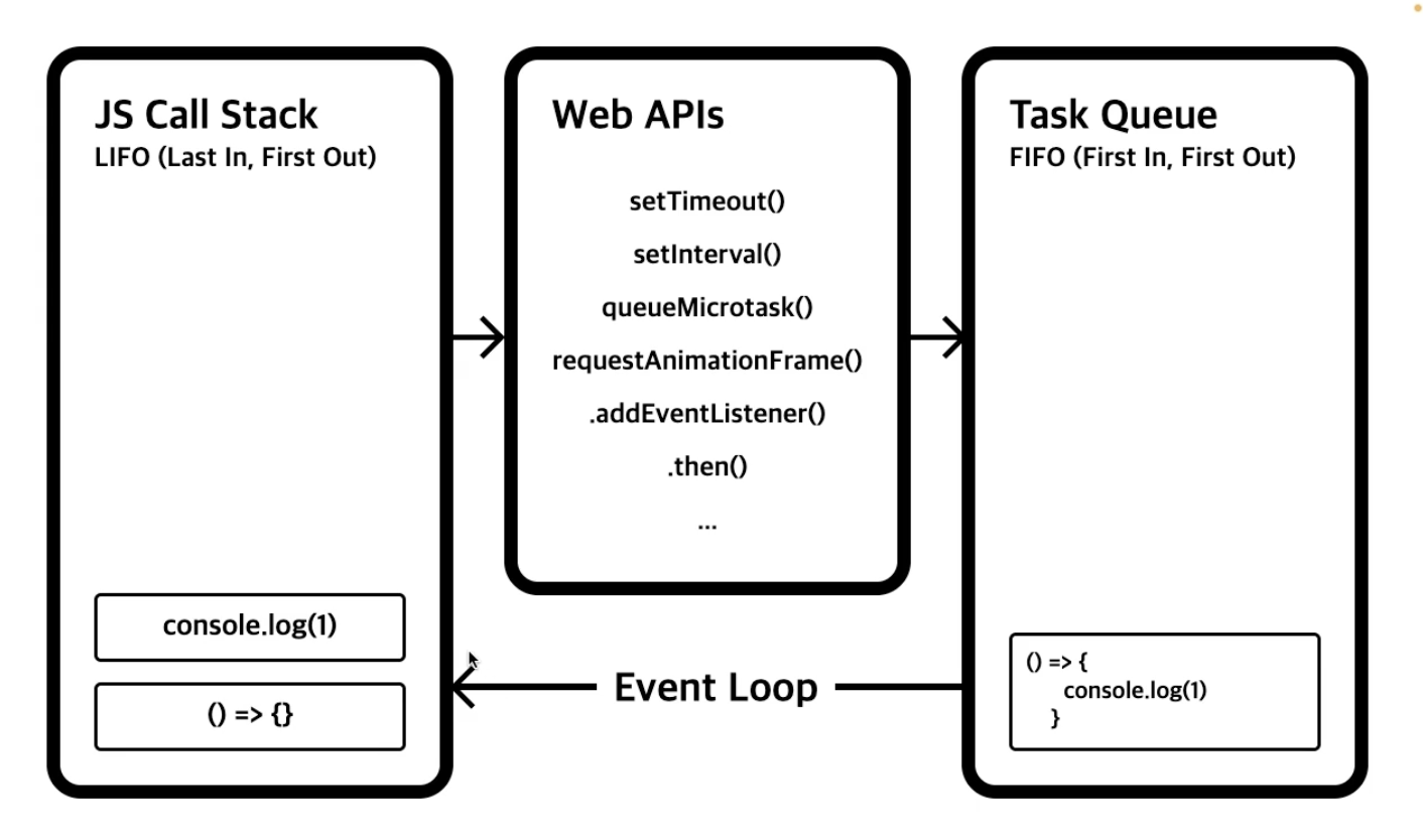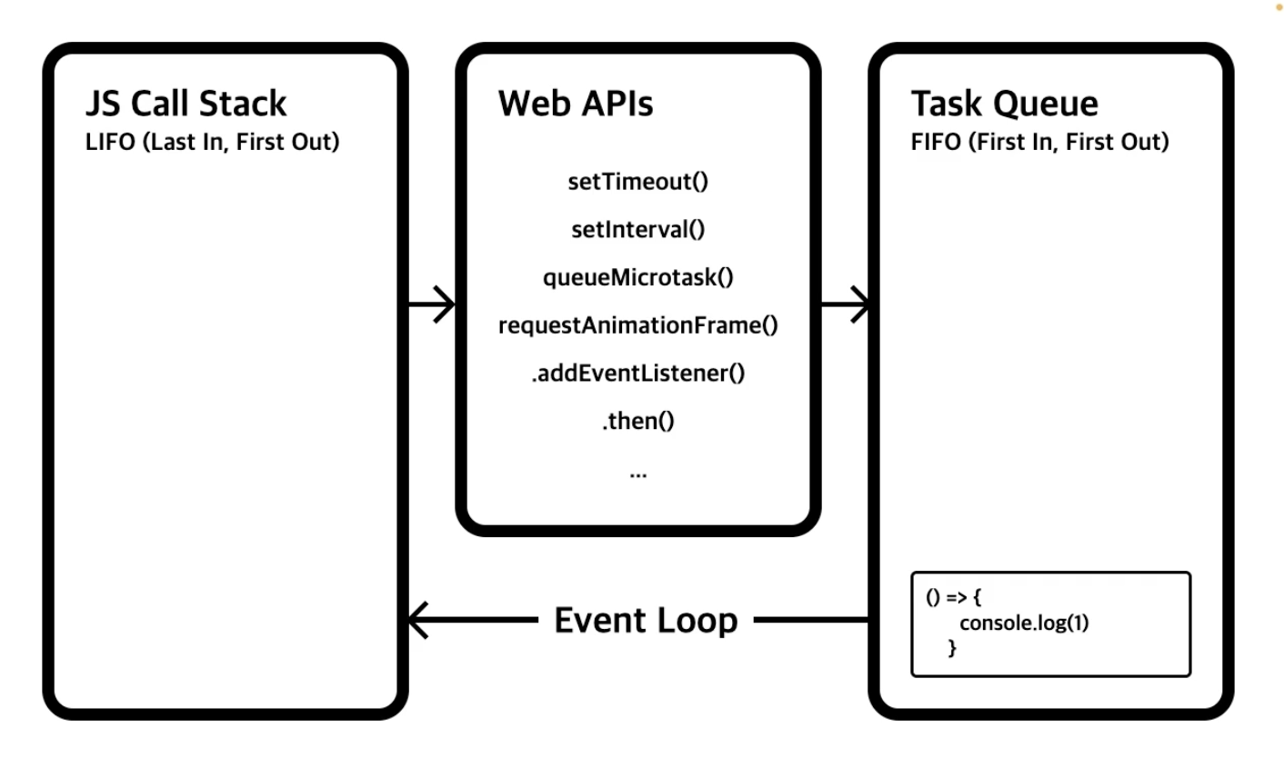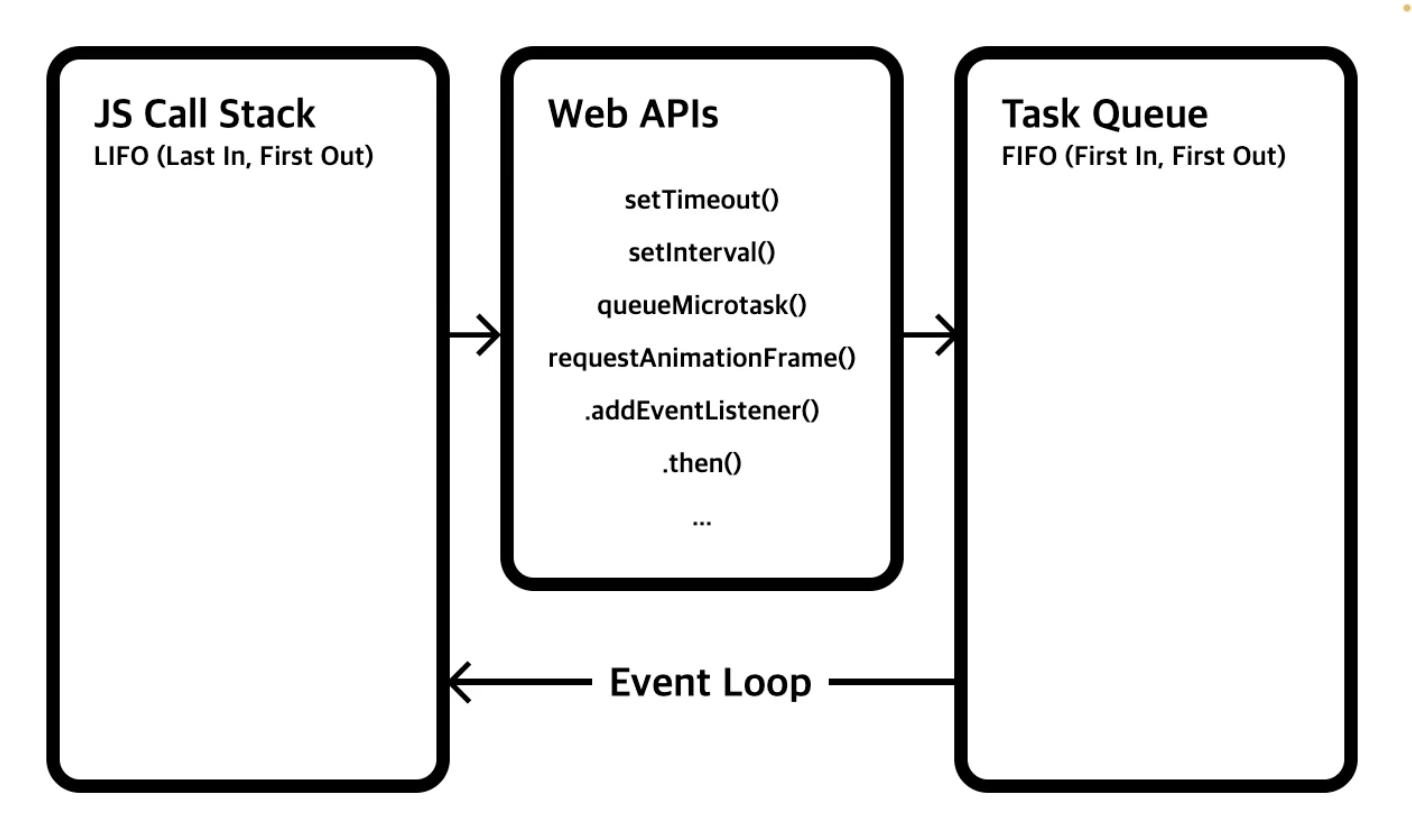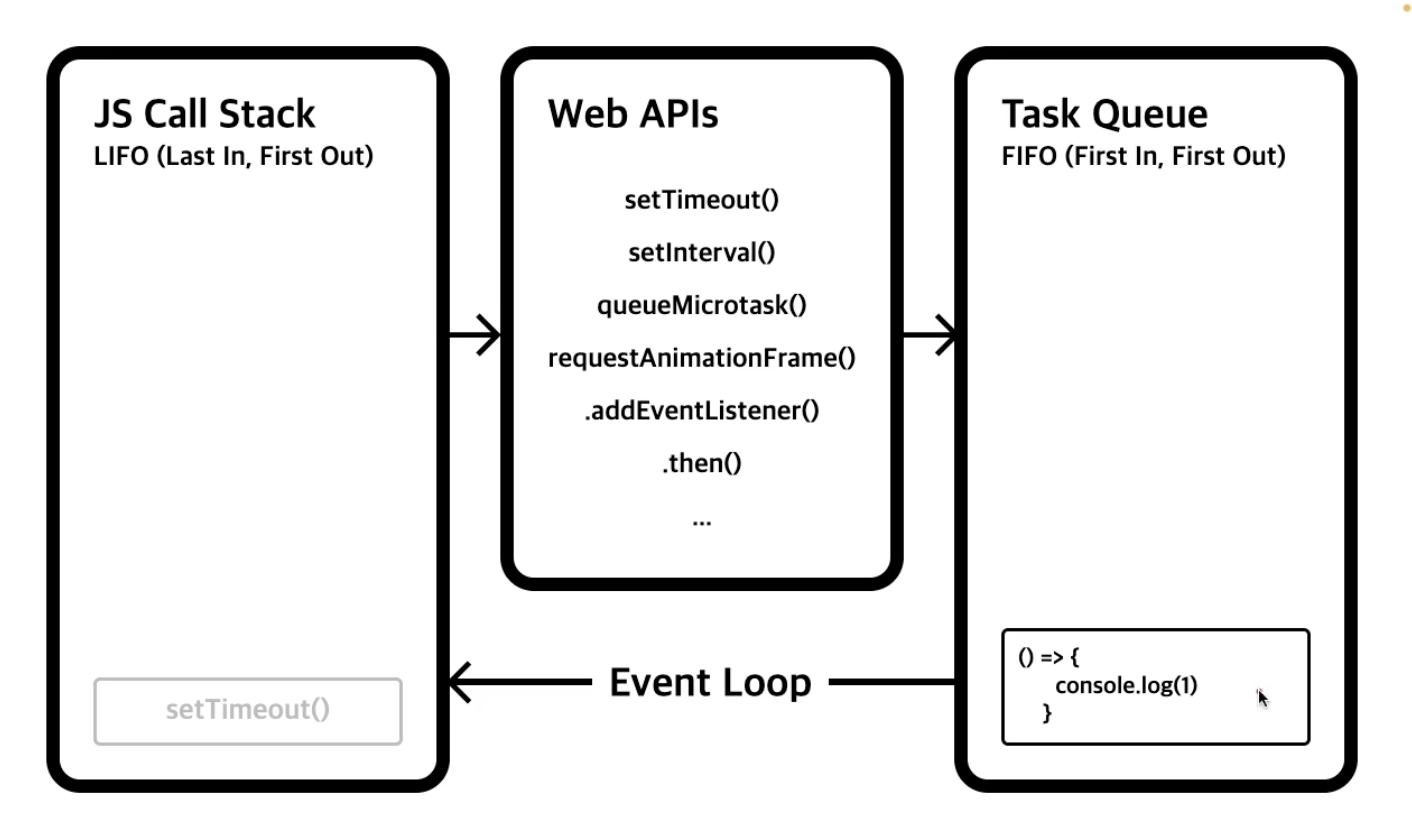 조금 더 쉽게 이해해보자면 JavaScript라는 프로그래밍 언어에서 직접적으로 동작할 수 있는 코드는 콜스택에 쌓여서 바로바로 실행될 수 있지만 대표적으로 setTimeout과 같은 함수는 JS 내부에서 지원하는 내용이 아니기 때문에 브라우저에서 제공하는 Web API의 도움을 받아 실행할 수 있고 그렇게 실행될 때 들어가는 콜백 함수는 Web API를 통해 바로 Call Stack으로 가는게 아니라 Task Queue에 쌓이는 구조를 가지게된다.