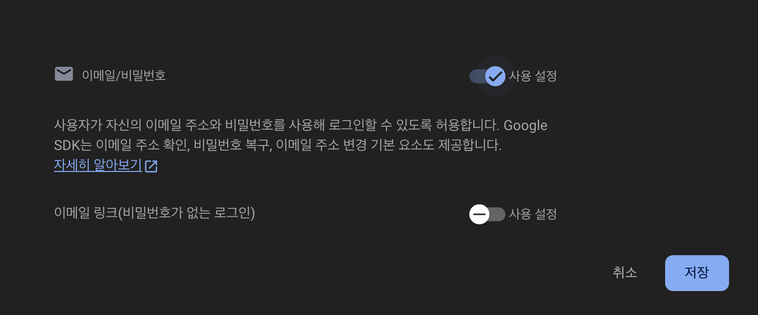 기본적인 이메일/비밀번호 클릭 -> 저장