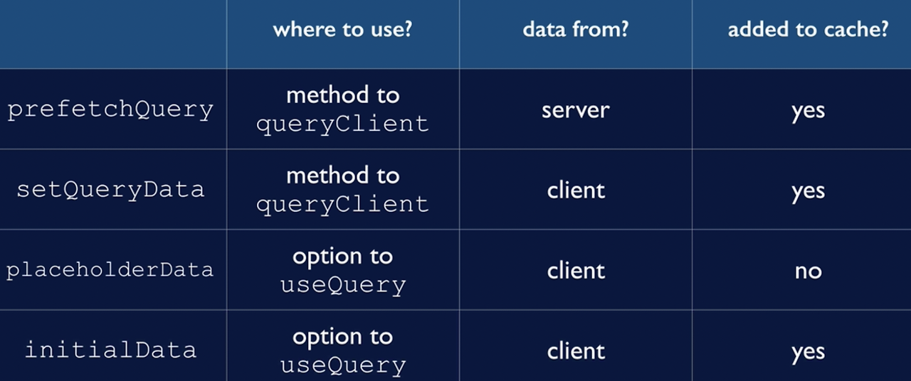 placeholderData는 useQuery의 옵션으로, useQuery 실행 시 데이터를 제공하기 때문에 클라이언트에서 데이터를 가져올 것이고 캐시에는 추가되지 않는다. placeholderData는 달리 표시할 데이터가 없는 경우 사용하는 임시로 채워놓는 표시용 데이터이다. (공식문서)