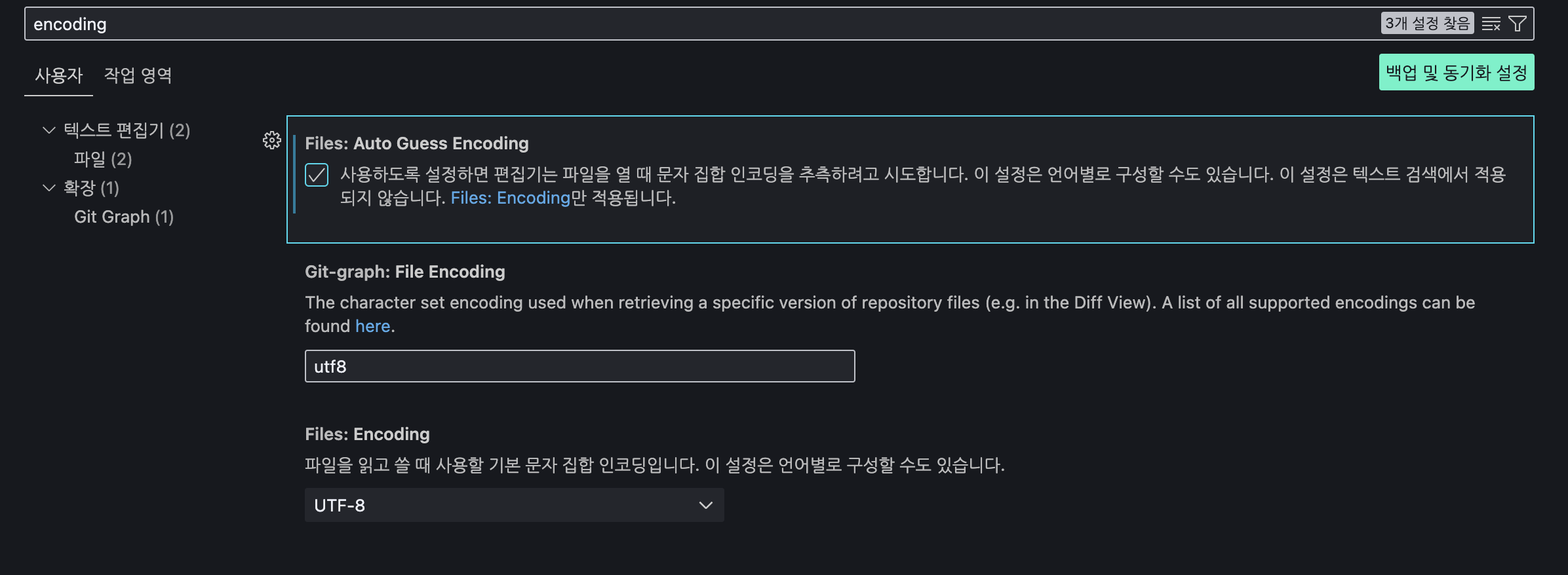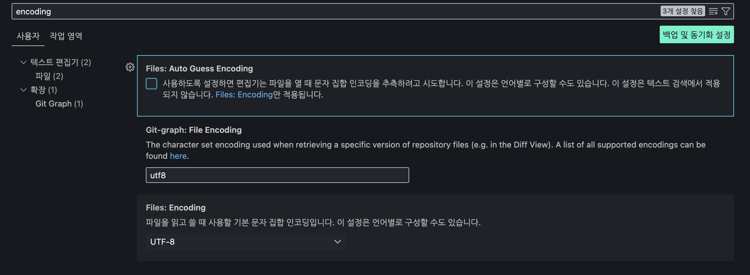 5. 설정창(cmd + , ) 을 들어가서 -> encoding 검색