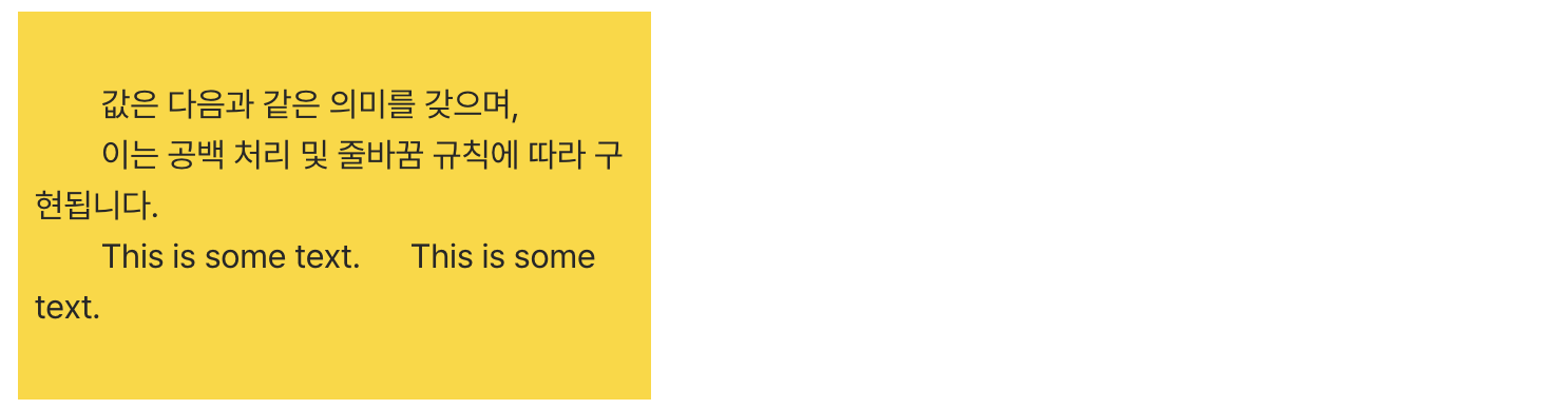 - 연속되는 공백을 인위적으로 하나로 합치지 않으며, 소스(소스 코드를 의미함)에서 줄바꿈 또한 그대로 유지하여 인위적인 공백의 축소를 하지 않습니다.