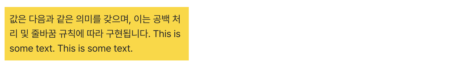- pre 값과 모든 것이 동일하게 구현되지만, normal 값의 경우처럼 필요에 따라 한 줄이 너무 길 경우 텍스트가 콘텐츠 박스의 끝에 도달했을 때 자동으로 줄바꿈시킨다는 것이 다릅니다.
