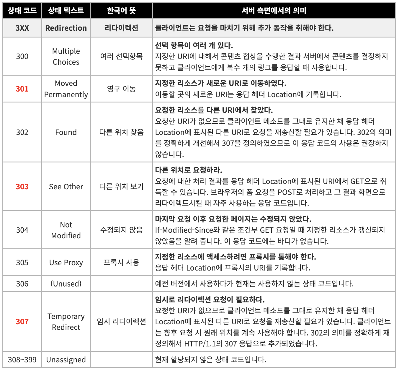 - 완전한 처리를 위해서 추가 동작이 필요한 경우입니다. 주로 서버의 주소 또는 요청한 URI의 웹 문서가 이동되었으니 그 주소로 다시 시도하라는 의미입니다.