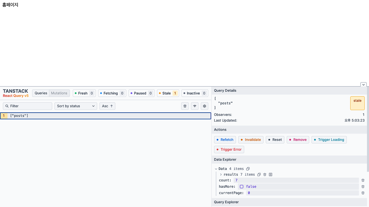 ['posts']라는 쿼리 키로 우리가 받아 온 포스트 데이터가 캐시에 저장되어 있는 것을 볼 수 있습니다.